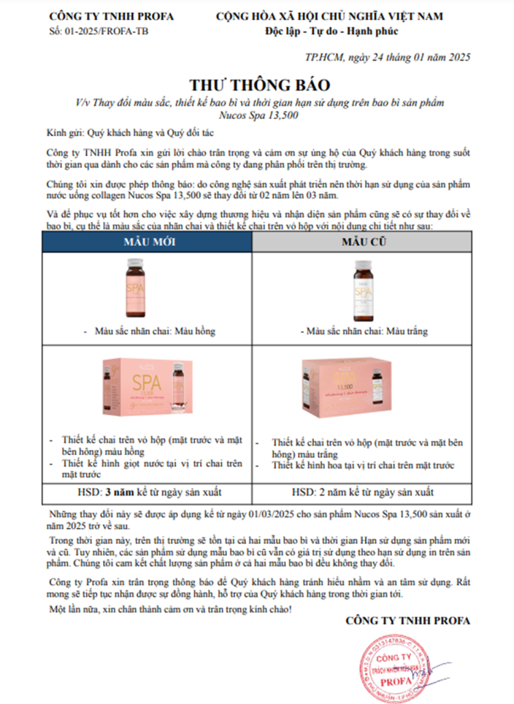 Để không ngừng nâng cao chất lượng sản phẩm và mang lại trải nghiệm tuyệt vời nhất cho khách hàng, chúng tôi đã tiến hành nghiên cứu và quyết định thực hiện thay đổi bao bì mới cho sản phẩm Nước uống Collagen Phục hồi lão hóa Nucos Spa 13,500, đồng thời điều chỉnh hạn sử dụng của các dòng sản phẩm nước uống collagen Nucos từ 2 năm lên 3 năm, áp dụng chính thức từ ngày 01.04.2025.