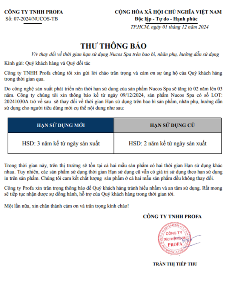 Chúng tôi xin được phép thông báo: do công nghệ sản xuất phát triển nên thời hạn sử dụng của sản phẩm của các dòng sản phẩm Nước uống collagen Nucos Spa 13,500, Nucos Spa 10,000, và Nucos Super White sẽ có thời gian sử dụng kéo dài từ 2 năm lên 3 năm. Thay đổi này giúp nâng cao chất lượng và bảo quản sản phẩm lâu dài hơn, mang lại trải nghiệm tốt hơn cho người sử dụng.